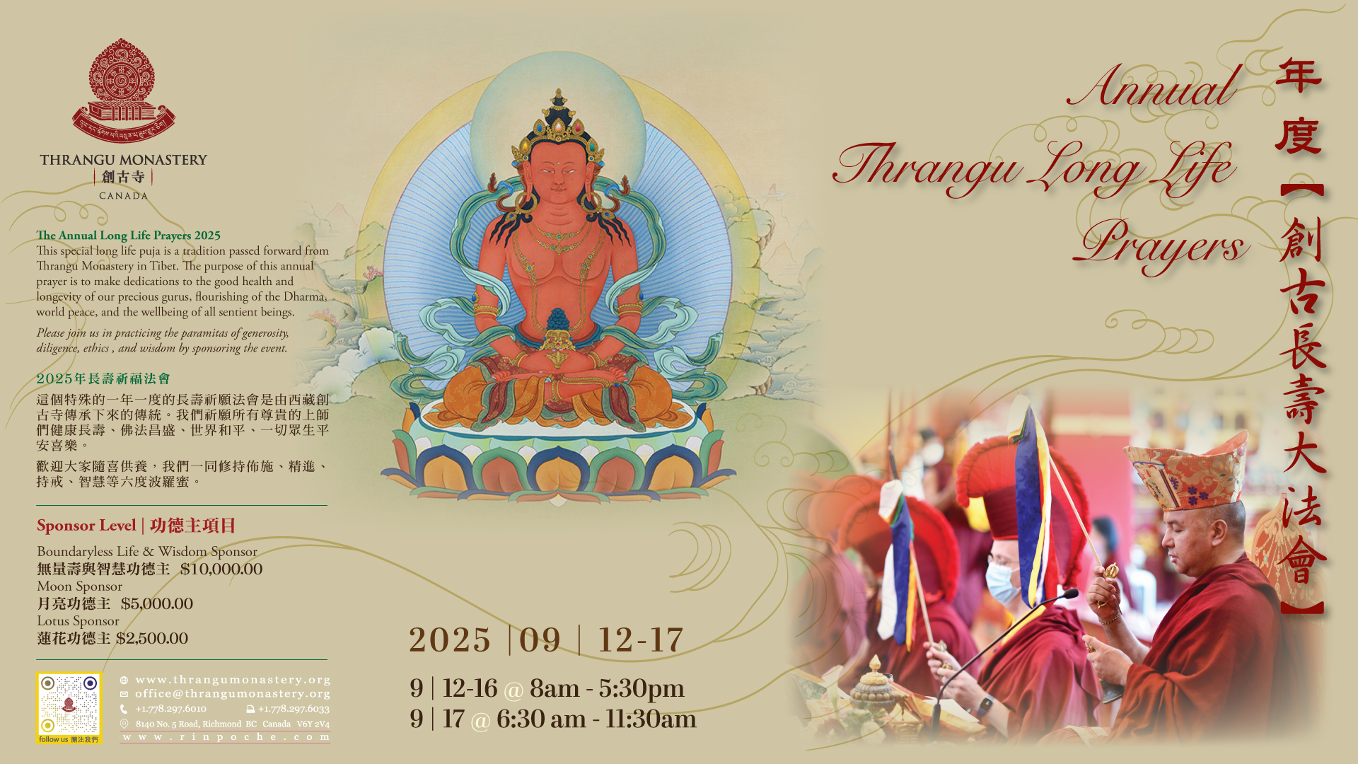 The monastery will be hosting the Annual Thrangu Long Life Prayers on September 12-16th from 8 am to 5:30 pm and September 17th from 6:30 am to 11:30 am.